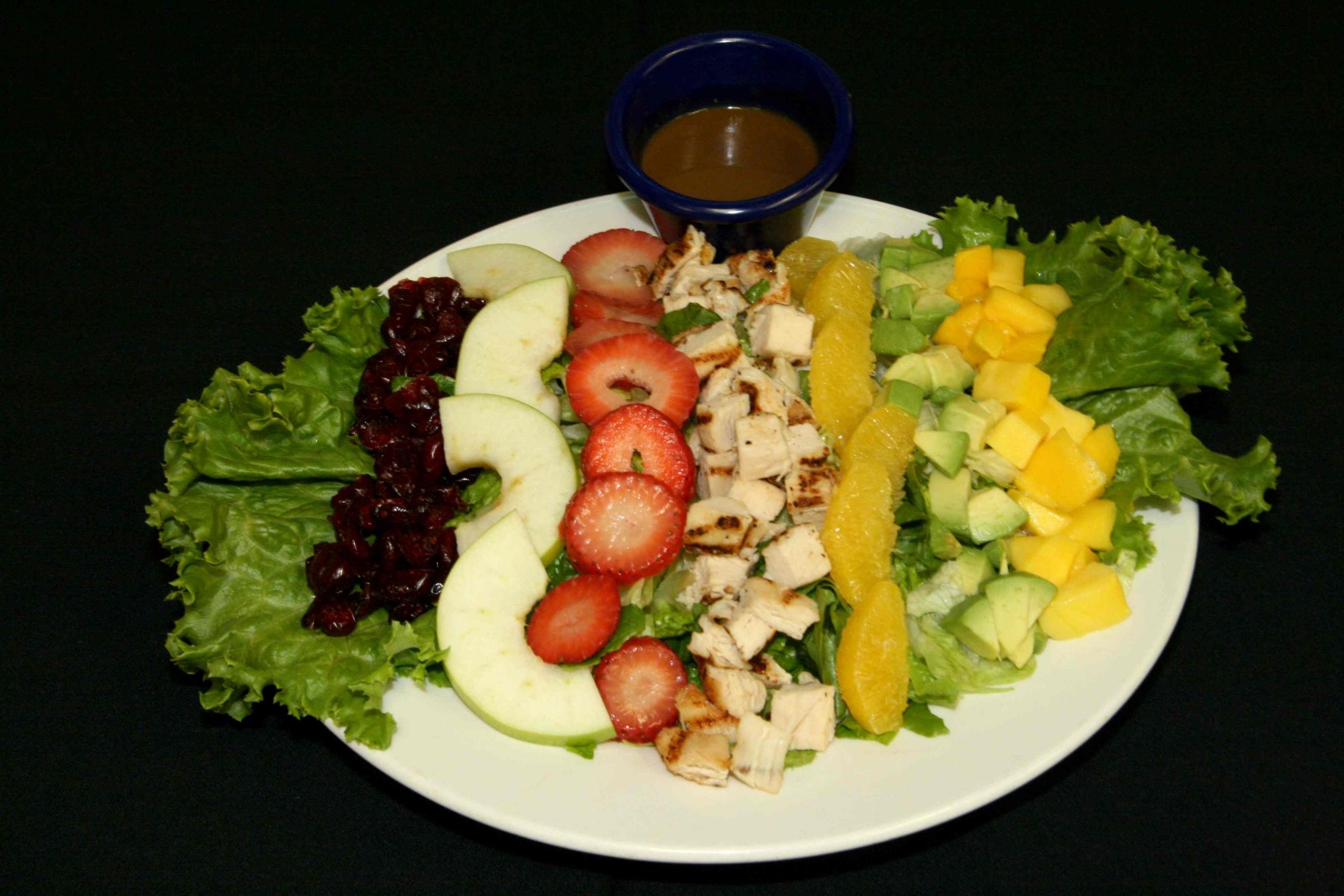 After we sat down we were served two small cups of their new salads – the Anti-Cobb salad with dried cranberries, apple, strawberries, avocado and mango; and a yummy Greek salad.