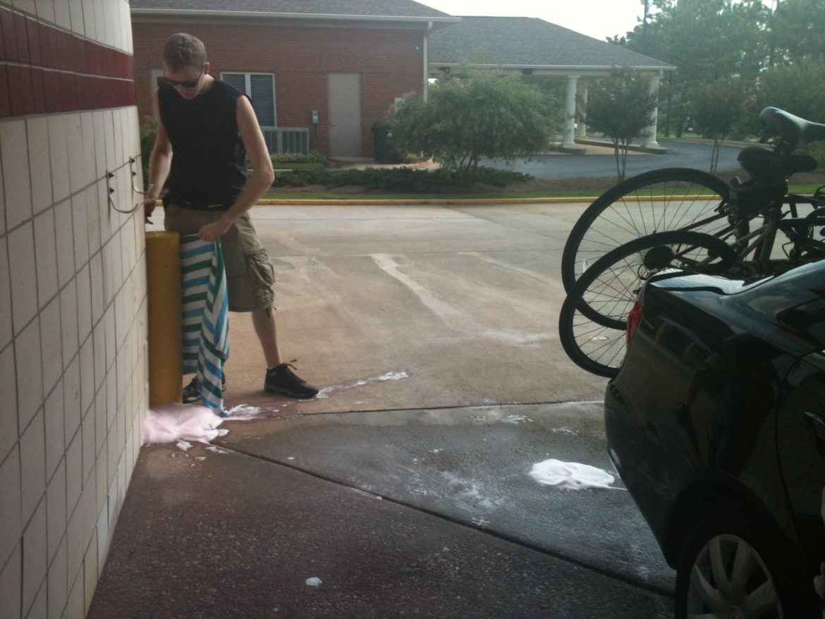 An hour later as we were touring through the beautiful campus of Auburn, we remembered. Uh oh. We got out to look. The great speckled car. Luckily, we found a car wash where we totally took advantage of the all-you-can-wash-for-$7 policy. My son whipped out his pocket knife and slashed a beach towel into thirds and we all bent down and got to work scrubbing the car, tediously removing each speck.