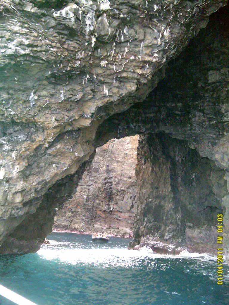 A short while into our trip, we were charmed by the dozens of dolphins who choose to “surf” along side us, as the captain slowed down so we could all get a good look. After sailing along the entire coast to see the soaring 1000-foot cliffs made famous by such movies as Jurassic Park, South Pacific and Six Days, Seven Nights, we pulled into a small cove for snorkeling. After receiving our equipment and a detailed lesson, we suited up in masks, snorkels and flippers then plopped ourselves off the side of the boat to explore in the slightly chilly waters. We enjoyed seeing the fish dart in and out of view and spotted a large turtle meandering along.