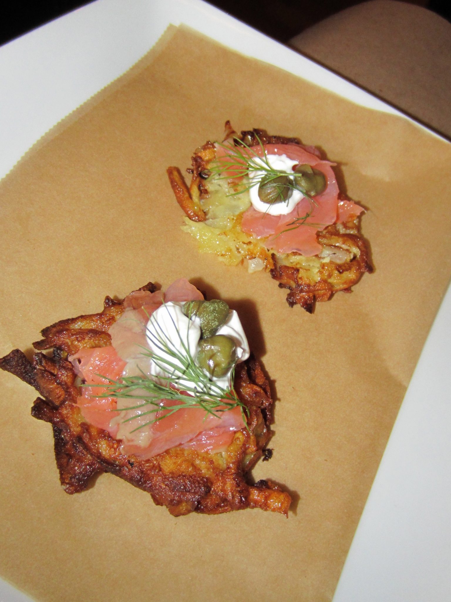 In addition to a few “big bites” like grilled salmon, grilled meatloaf and mushroom ravioli, Sun in My Belly now is offering a Supperclub menu Tuesday through Sunday, a four-course meal for $35 that changes weekly. We opted for one order of fried chicken and one Supperclub menu, which that night include potato latkes with smoked salmon, capers and crème fraiche, watercress salad, grilled flank steak and pineapple upside-down cake. (Check the website for the weekly menu.)