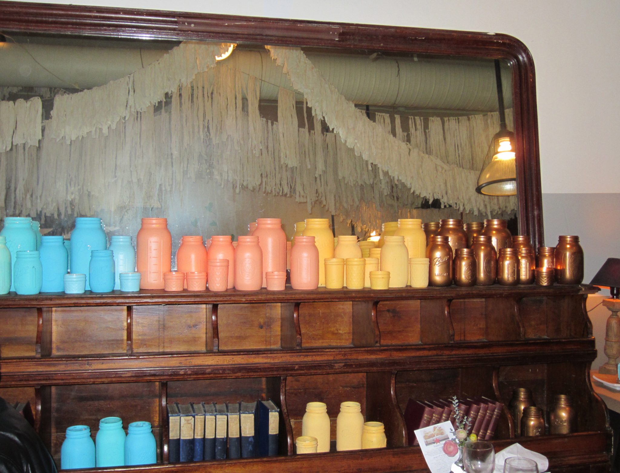 First the décor. This was my first visit to the neighborhood café, opened by partners Alison Luker and Max LeBlanc, although I’d enjoyed Sun in My Belly’s catering for years at events and at the Atlanta Botanical Garden. I instantly fell in love with the large, yet cozy feeling space. The tables are covered with brown paper and colorful votive holders, which upon closer inspection, turned out to be painted detergent caps. The mantle in the dining room where we ate was crammed with candle-filled colorfully painted jars and more detergent caps. Unpretentious, comfortable and relaxing.