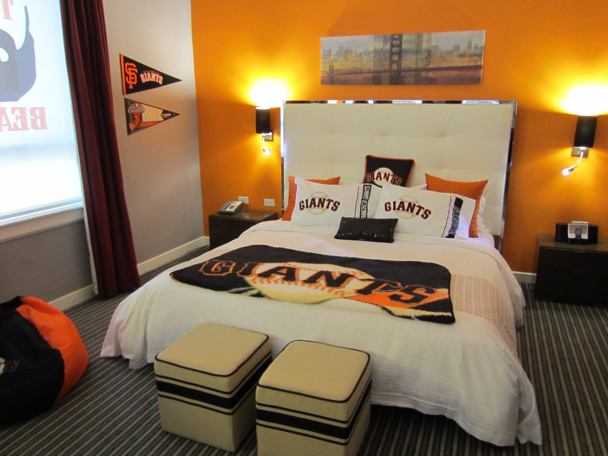 Giants fans will feel right at home in the brand-new Giants Suite. Painted bright orange, the suite is covered in Giants items with window shades that say Fear the Beard.